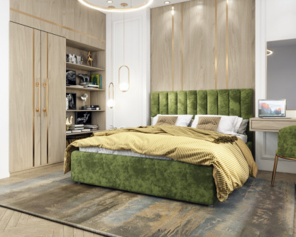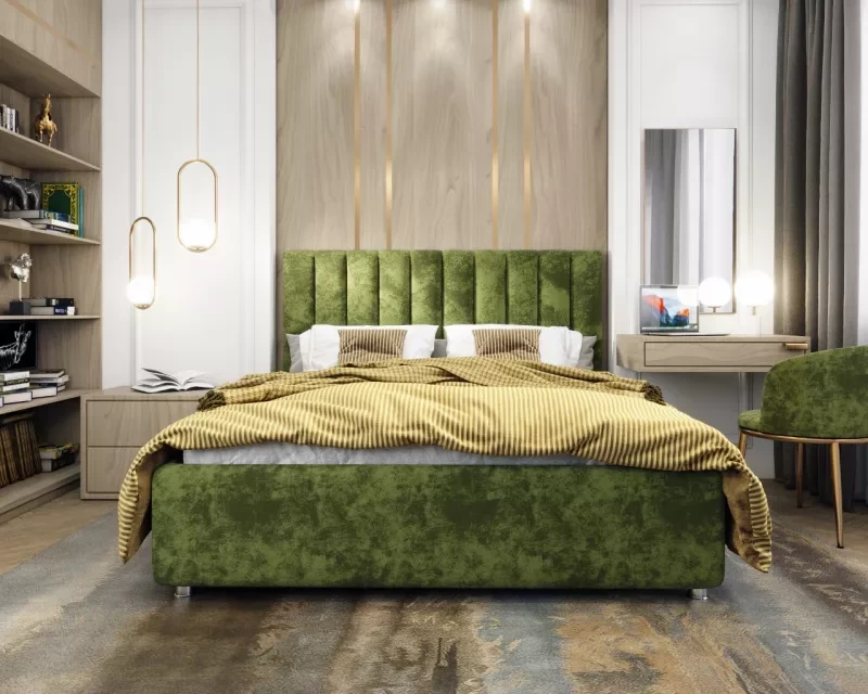 Кровать с мягким изгловьем, выполненным в виде 10 вертикальных панелей (вертикальная утяжка, всегда 10 шт независимо от размера спального места, с увеличением размера спального места увеличивается ширина панели), отличный вариант для спален с низкими потолками: вертикальный полосы на изголовье визуально вытягивают пространство.