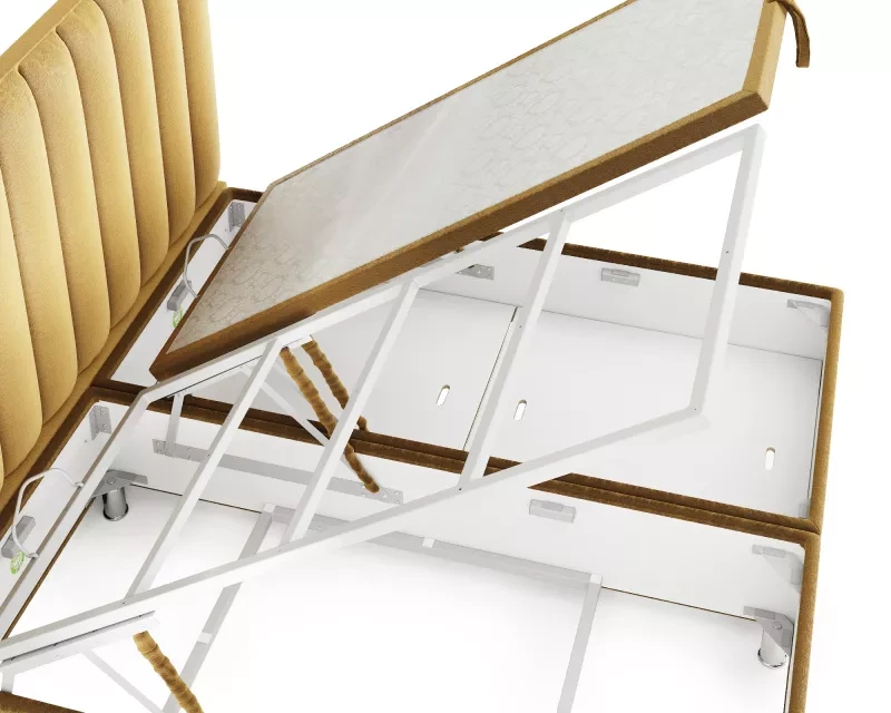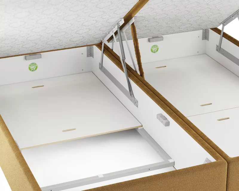 Основание BOX c механизмом подъема и местом для хранения оборудовано сдвижным полом (толщина 10 мм., прочно и надежно опирается на металлическую раму каркаса) лучше всего подходит для премиальных матрасов и не имеет ограничений по нагрузке (до 300кг на 1 ящик)!