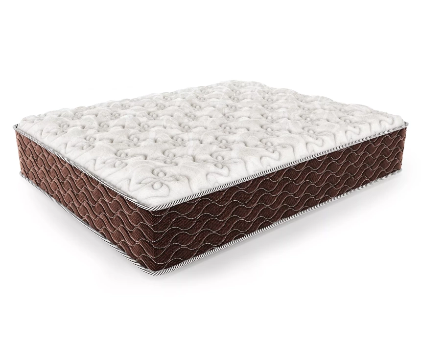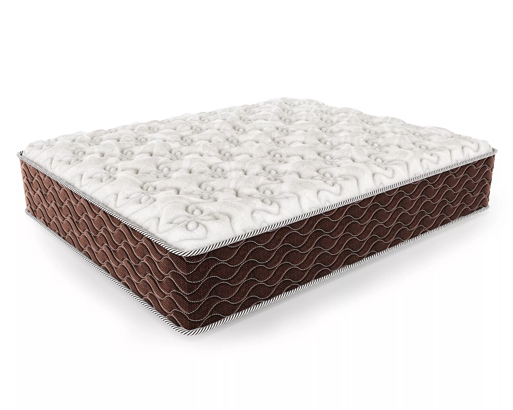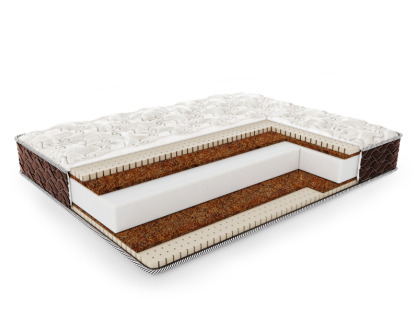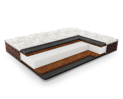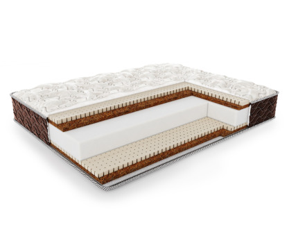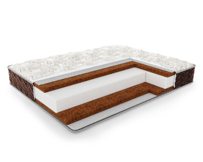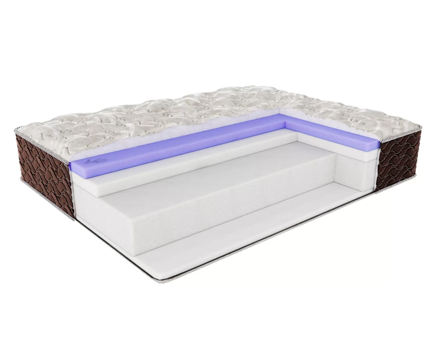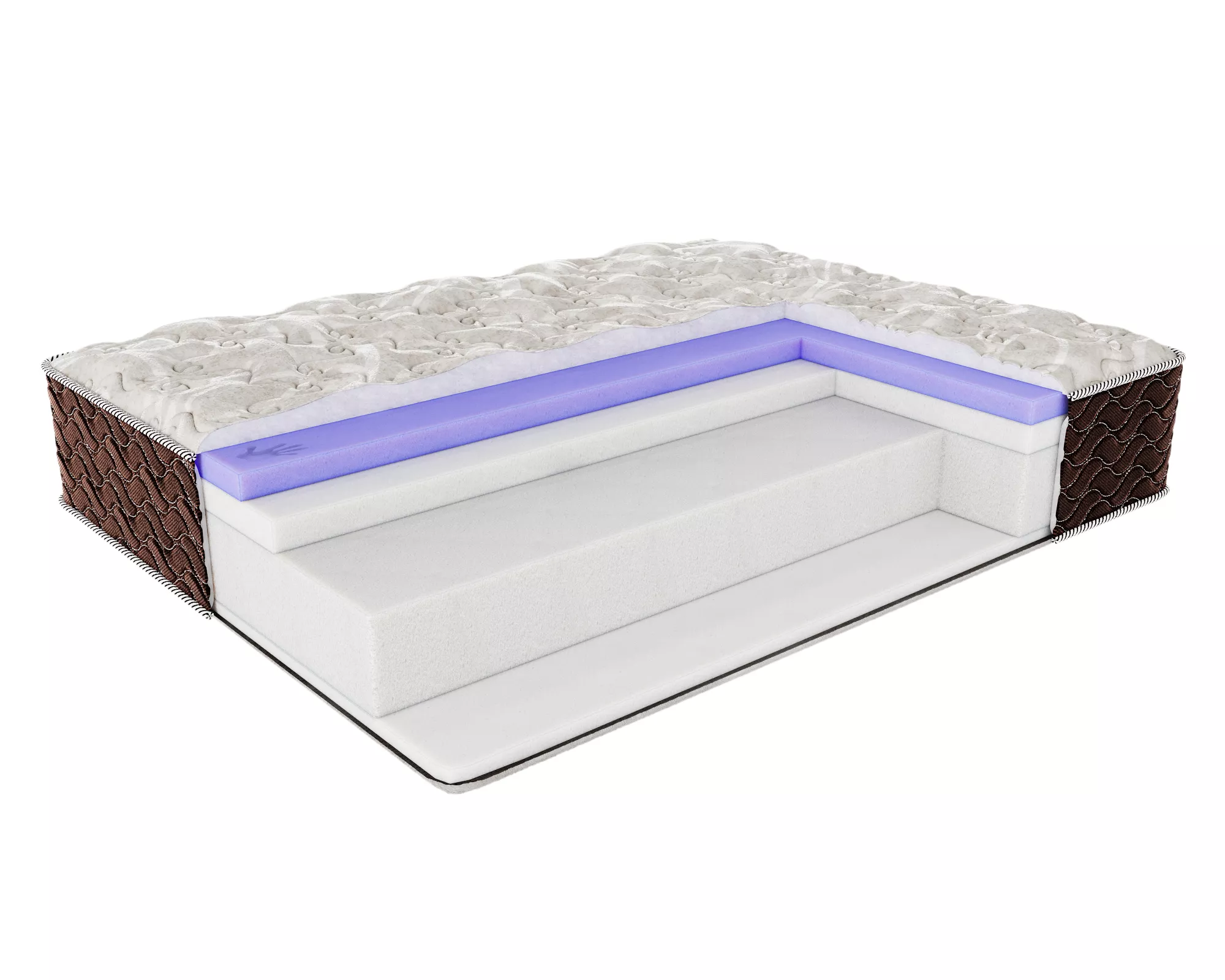 Чехол: несъёмный, из плотной трикотажной ткани с содержанием льна, простёган на искусственном волокне Холлкон (200 гр) и 0,8 см пены - пышность и объём. Бурлет матраса выполнен из плотного мебельного жаккарда шоколадного цвета, простёганного на ППУ 1 см — усиление периметра, сохранение геометрии матраса на протяжении всего срока службы.