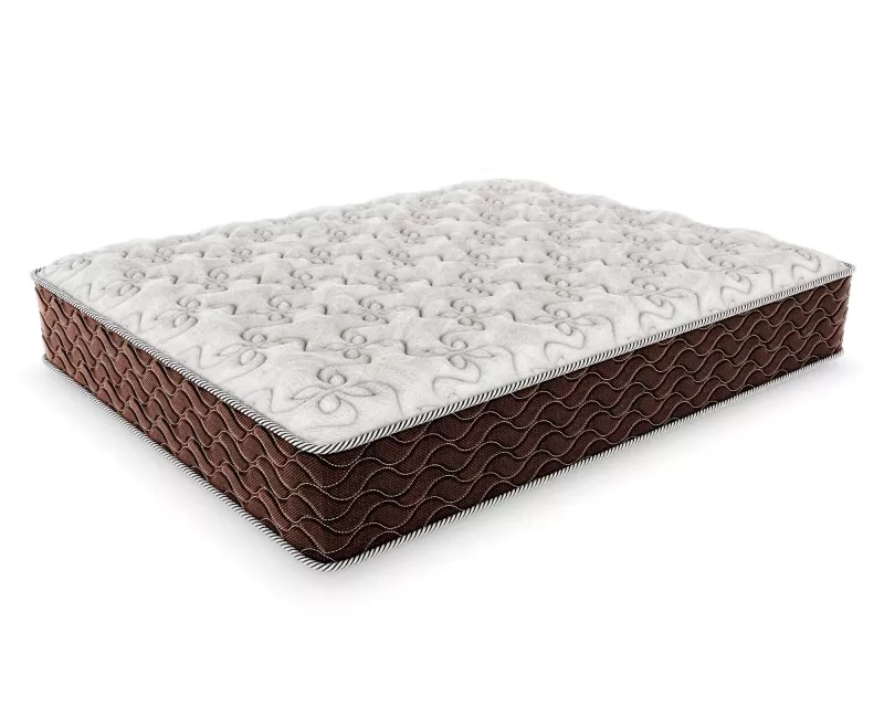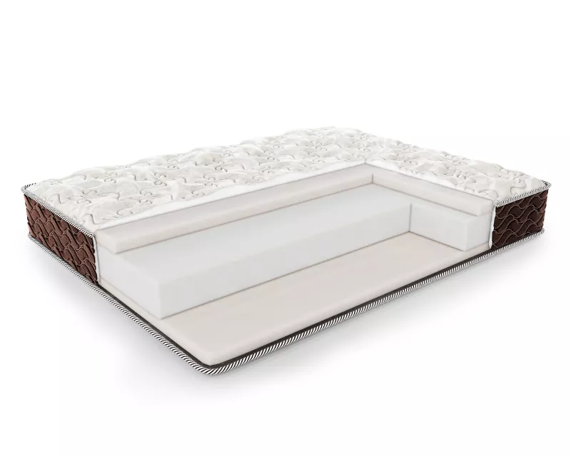 Чехол: несъёмный, из плотной трикотажной ткани с содержанием льна, простёган на искусственном волокне Холлкон (200 гр) и 0,8 см пены - пышность и объём. Бурлет матраса выполнен из плотного мебельного жаккарда шоколадного цвета, простёганного на ППУ 1 см — усиление периметра, сохранение геометрии матраса на протяжении всего срока службы.