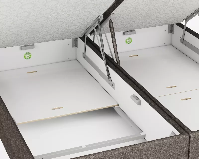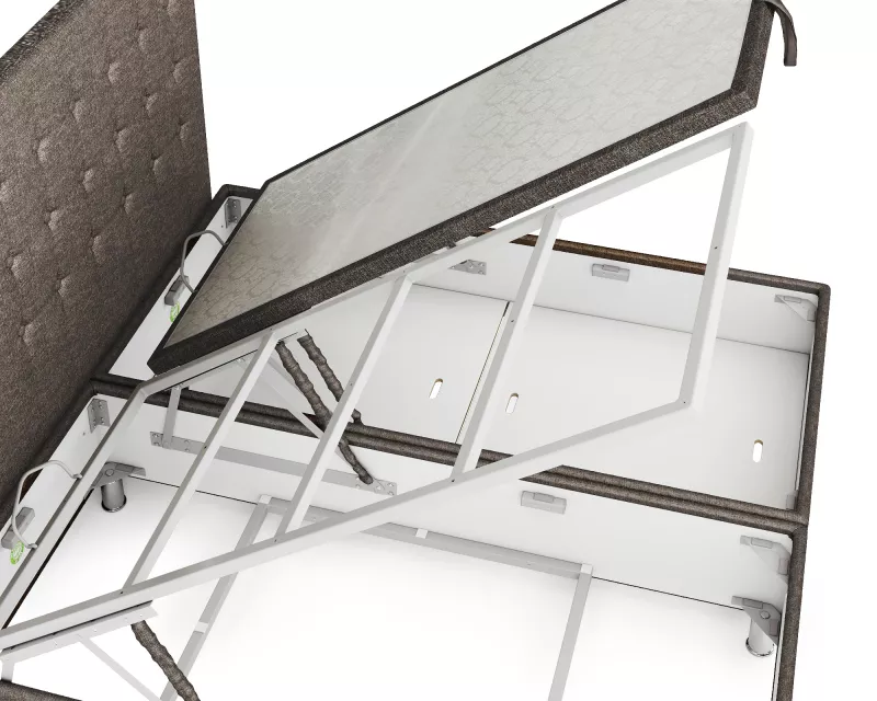 Основание BOX c механизмом подъема и местом для хранения оборудовано сдвижным полом (толщина 10 мм., прочно и надежно опирается на металлическую раму каркаса) лучше всего подходит для премиальных матрасов и не имеет ограничений по нагрузке (до 300кг на 1 ящик)!