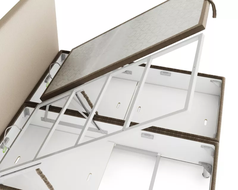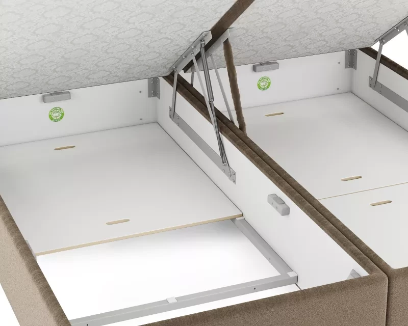 Основание BOX с местом для хранения оборудовано сдвижным полом (толщина 10 мм., прочно и надежно опирается на металлическую раму каркаса) лучше всего подходит для премиальных матрасов и не умеет ограничений по нагрузке (до 300кг на 1 ящик)!