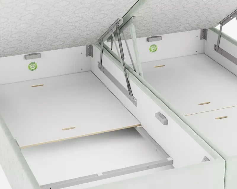 Основание BOX c механизмом подъема и местом для хранения оборудовано сдвижным полом (толщина 10 мм., прочно и надежно опирается на металлическую раму каркаса) лучше всего подходит для премиальных матрасов и не имеет ограничений по нагрузке (до 300 кг на 1 ящик)!